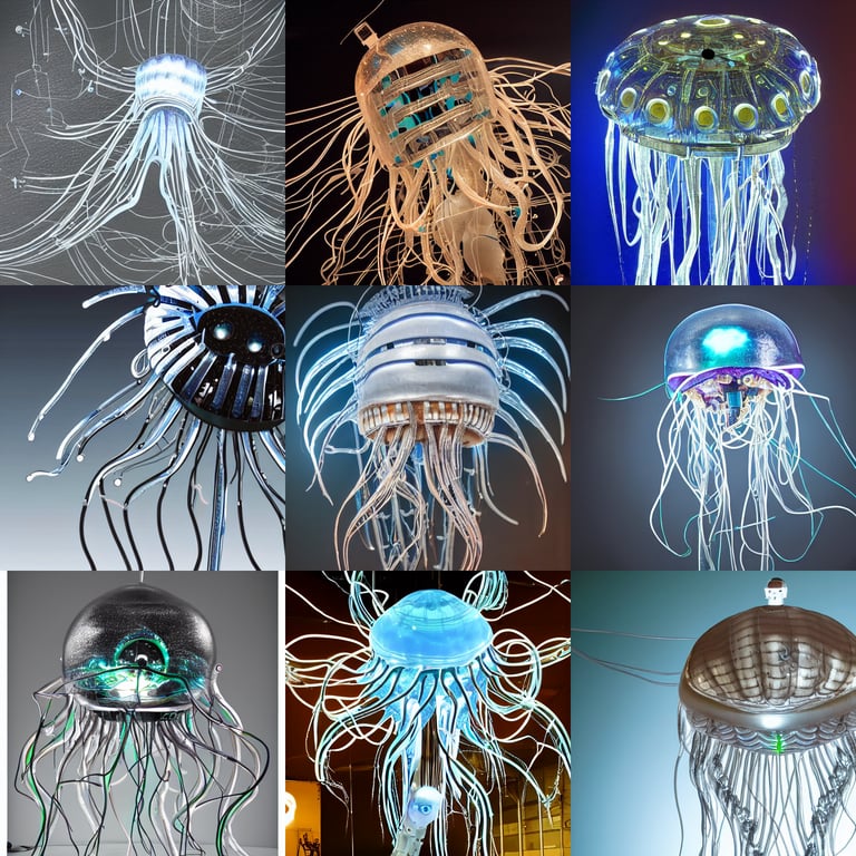 prompthunt A robotic, metallic jellyfish, crackling with